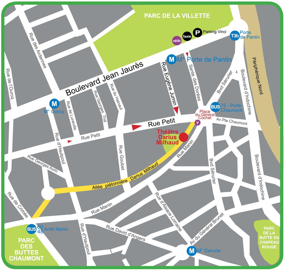 Par la route : périphérique nord, sortie Porte de Pantin : vous êtes à 400m du Théâtre.
